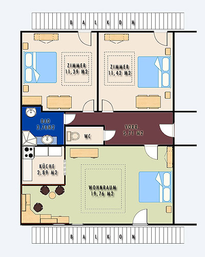 Wohnraum mit Essecke, ausziehbarer Schlafcouch, 2 getrennte Schlafzimmer, Küche Dusche mit 2 Duschkabinen,Haarfön,Kosmetikartikel , WC getrennt, Vorraum 1 süd-,1 nordseitiger Balkon, Parkettboden, Bettwäsche, Handtücher inkludier. Flatscreen , W-Lan (gegen Gebühr).Apartement Plan